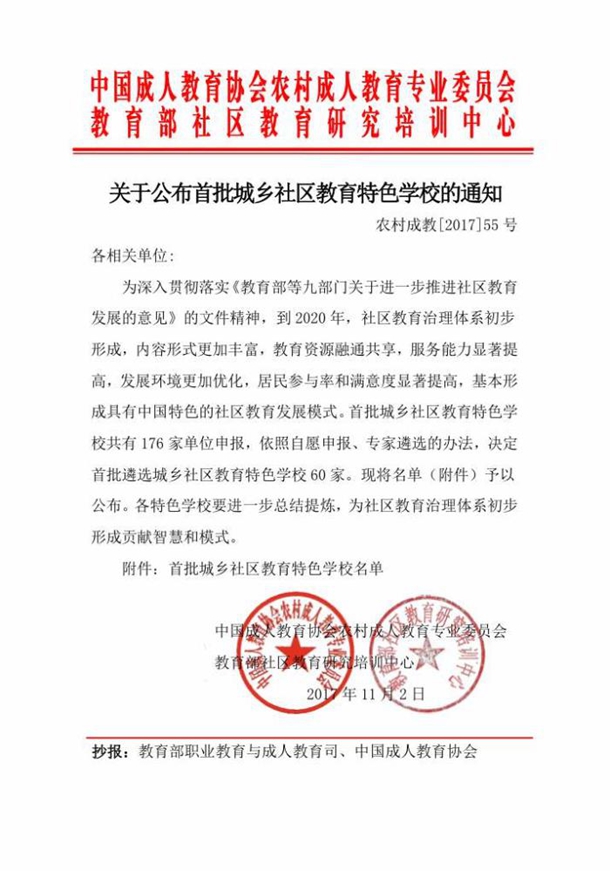11月2日,中國(guó)成人教育協(xié)會(huì)農(nóng)村成人教育專業(yè)委員會(huì)、教育部社區(qū)教育研究中心公布了【2017】55號(hào)文件:《關(guān)于公布首批城鄉(xiāng)社區(qū)教育特色學(xué)校的通知》。澄江街道成人教育中心校被評(píng)為全國(guó)“首批城鄉(xiāng)社區(qū)教育特色學(xué)校”,且是江陰成教系列唯一獲評(píng)學(xué)校。