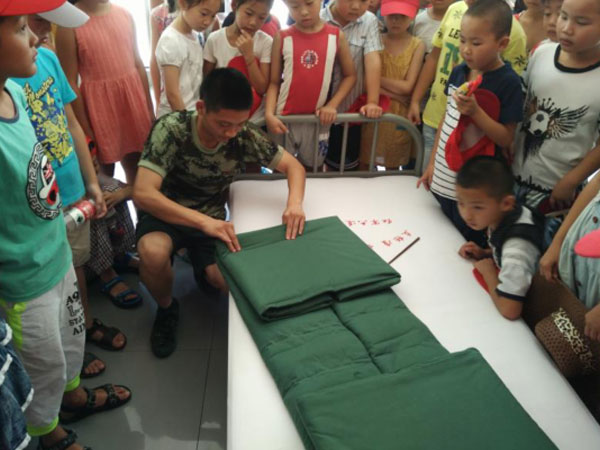 小學生們走進駐侖某部隊營區(qū),瞬間被軍營里的氛圍所感染。在官兵的帶領下,小學生們先后參觀了宿舍、學習室、榮譽室等場所??粗麧嵉膬葎?,小學生們驚嘆不已,讓他們好奇的是“豆腐塊”被子是如何疊成的。在訓練場,戰(zhàn)士們演示了擒敵術、障礙訓練等,小學生們感受了部隊嚴謹細致的過硬作風,勇猛頑強的意志品質。