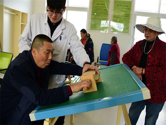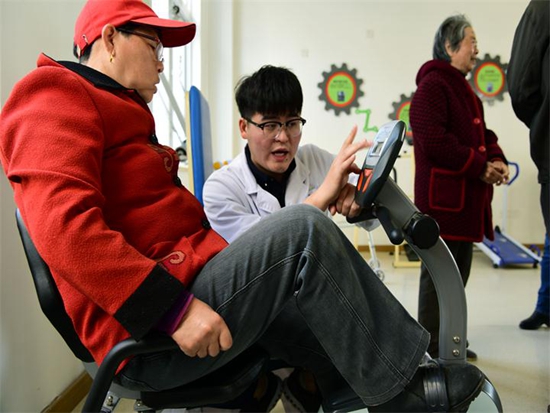 志愿者正在指導(dǎo)肢體殘疾居民通過(guò)康復(fù)器械進(jìn)行肢體訓(xùn)練活動(dòng)