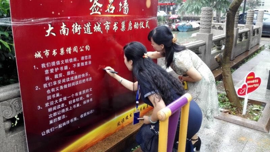 伴隨著優(yōu)美的開場(chǎng)白,荷花社區(qū)分校城市書巢啟動(dòng)儀式拉開帷幕,大南街道領(lǐng)導(dǎo)林慧委員、荷花社區(qū)分校方芙雪校長(zhǎng)月光大廈業(yè)委會(huì)共同為城市書巢揭開紅綢。轄區(qū)的居民有絡(luò)繹不絕過來捐獻(xiàn)書籍的,都會(huì)得到社區(qū)贈(zèng)予的一盆多肉綠植,贈(zèng)人書籍手留余香,由黨員志愿者整理審閱舊書后放入書巢。最后參與活動(dòng)的人員在文明借閱承諾墻上簽下名字。