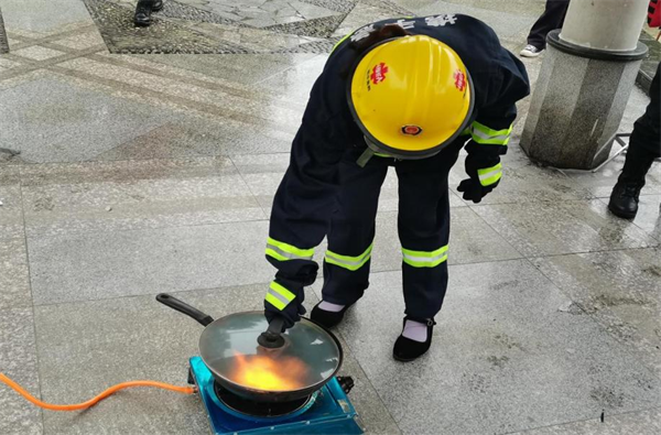 活動中,除了聽老師講解理論知識,居民們還通過實操環(huán)節(jié),積極參與體驗了使用鍋蓋、滅火毯和油鍋滅火瓶等多種方式的油鍋初起火撲滅。