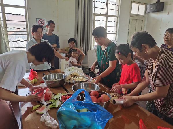 活動開始,志愿者首先介紹了本村的果品種植情況,并對梨的生長環(huán)境、生長周期等知識進(jìn)行了科普,并請小朋友分享了自己對梨的認(rèn)知和食梨的益處。之后大家便來到梨園進(jìn)行親子采摘,在家長的幫助下,不一會兒,大家就都收獲滿滿。最后,大家便用采摘來的梨混合其他果蔬學(xué)習(xí)制作清涼飲料,大家分工協(xié)作,削皮的削皮,切塊的切塊,榨汁的榨汁,忙得不亦樂乎。果汁制作完成后,大家便為在高溫天氣下工作的環(huán)衛(wèi)工人送上了這清涼飲料。