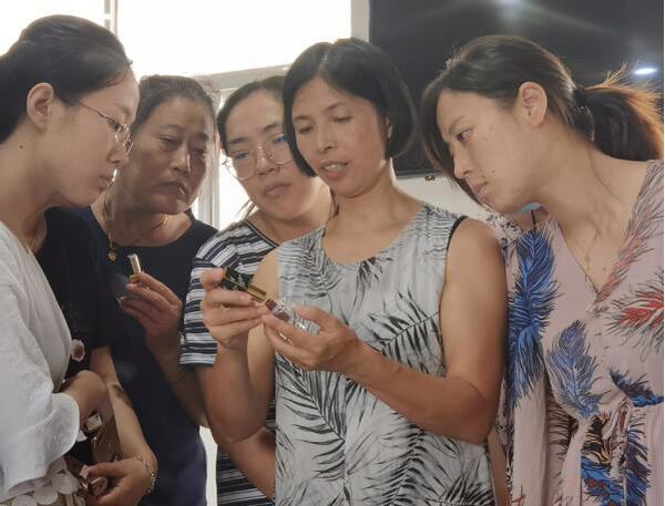 活動(dòng)現(xiàn)場(chǎng),桌上擺著色粉、油、蜂蠟、維E、模具、燒杯、小秤等工具。據(jù)悉,所用的材料都是食品材質(zhì)的,無任何添加劑。老師給學(xué)員一一介紹了口紅制作的材料、制作方法和注意事項(xiàng),還介紹了蜂蠟、維E等材料在生活中的作用及用途,使學(xué)員既掌握了一門技術(shù)又增長(zhǎng)了知識(shí)。大家聽得格外認(rèn)真,個(gè)個(gè)躍躍欲試,口紅制作看似簡(jiǎn)單但實(shí)際操作起來卻需要足夠的細(xì)心和耐心。學(xué)員們通過稱重、攪拌、固定等一系列步驟,專屬定制的各種色號(hào)的口紅出爐了,“好神奇呀!”“這顏色可真好看!”現(xiàn)地不時(shí)傳來一聲聲驚訝和贊嘆聲,愛美的女神們笑作一團(tuán),臉上洋溢著自信與美麗。
