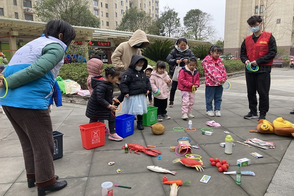 在垃圾分類互動(dòng)游戲環(huán)節(jié),設(shè)置了“垃圾在哪兒”“知識(shí)大百科”“環(huán)保大富翁”三個(gè)環(huán)節(jié),孩子們?cè)谏鐓^(qū)教育志愿者們的指導(dǎo)下,運(yùn)用自己學(xué)會(huì)的知識(shí)逐一闖關(guān)。“廚余垃圾在哪兒?”“有害垃圾在哪兒?”隨著老師們的“一聲令下”,孩子們將手中的圈圈套在對(duì)應(yīng)的垃圾種類上,現(xiàn)場(chǎng)洋溢著歡樂的氣氛。最后率先完成3個(gè)游戲環(huán)節(jié)的小朋友最早獲取接下來需要的環(huán)保手工制作材料。