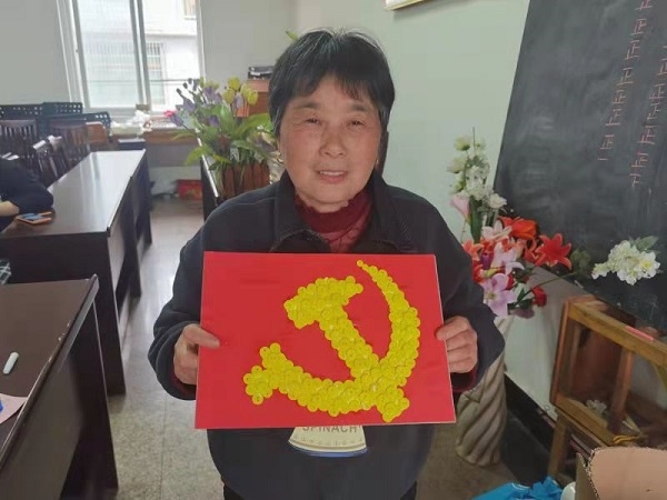 “今年是建黨100周年,今天我們用特殊的方式來為我們祖國慶祝。”培訓(xùn)活動伊始,中心教師向大家展示了制作工藝、講解了制作步驟,參加的老人們充分發(fā)揮自己的手藝,互相幫助,分工合作,用一個個黃色的扣子繪制著黨旗和國旗。“想不到我還能親手制作一面國旗,突然感覺自己的心跟我們的偉大祖國貼的好近”、“你的扣子貼做得真好,快點(diǎn)傳授點(diǎn)經(jīng)驗給我,我一定要把我心中的黨旗做得最完美”......大家互相討論著各自的作品,感受著做手工帶來的樂趣,也在一句一言中表達(dá)著對黨對祖國的深切之情。