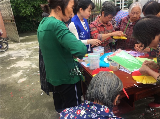 今天的活動以“愛就在身邊”為主題,在即將到來的520告白日,心家園社工教授“助人為樂”服務隊制作手工折紙花,借花表達心中的無限柔情蜜意?;顒蝇F(xiàn)場,心家園社工將隊員們分成三組,各組推選出一位組長負責協(xié)調(diào)組員們開展活動。然后社工一邊用彩色卡紙示范一邊解說詳細制作過程和注意事項。各組服務隊成員們按照社工的步驟,利用現(xiàn)有的材料,認認真真的開始創(chuàng)作自己的花兒。在制作過程中,各組隊員在組長的帶領下分工協(xié)作,有的擅長折紙,有的很會剪裁,有的負責粘貼,他們互幫互助、相互配合,偶爾還和隔壁組交流制作心得,現(xiàn)場氣氛活躍而融洽。