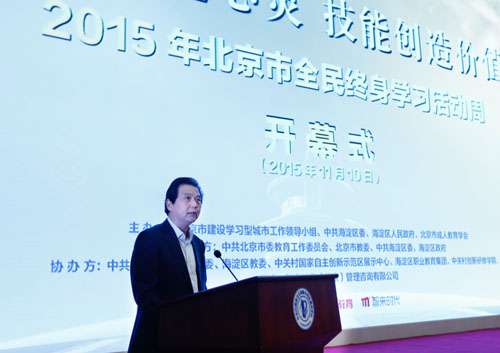 11月10日上午,以“知識啟迪心靈技能創(chuàng)造價值”為主題的2015年北京市全民終身學(xué)習(xí)活動周開幕式暨海淀區(qū)職業(yè)教育發(fā)展高峰論壇在北京市海淀區(qū)中關(guān)村國家自主創(chuàng)新示范區(qū)展示中心隆重舉行。