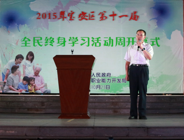 胡細銀副區(qū)長在講話中肯定了開幕式內容豐富、節(jié)目精彩、形式新穎。同時,他強調,學習是建設創(chuàng)新型城市的基礎,終身學習能夠讓我們高雅,讓我們快樂,讓我們的夢想實現(xiàn),要把終身學習作為面對21世紀和未來最要緊的事情來對待。對于寶安區(qū)終身教育和社區(qū)教育工作今后發(fā)展,他指出要加快完善我區(qū)終身教育體系,辦成辦好寶安區(qū)社區(qū)學院,鼓勵辦好企業(yè)大學,探索成立創(chuàng)客學院;打造學習型城區(qū)、學習型社區(qū),廣泛開展各類學習型組織創(chuàng)建活動;擴大學習服務的對象和范圍,豐富學習的方式,加快建設具有PC端、手機APP和微信公眾號等多終端的社區(qū)教育和職業(yè)培訓數(shù)字化學習平臺,為實現(xiàn)“人人學習、處處學習、時時學習”提供支持和保障,通過科技手段加強線上線下互動學習,打造學習圈,積累學習行為數(shù)據,加快學習成果轉化,激發(fā)居民的學習熱情和創(chuàng)造潛能。最后,他期望看到寶安市民終身學習蔚然成風,甚至在全市也能引領潮流,以及引用了高爾基“書籍是人類進步的階梯”名言,號召廣大居民“活到老,學到老”,通過學習在進步的階梯上邁出堅實的步伐。