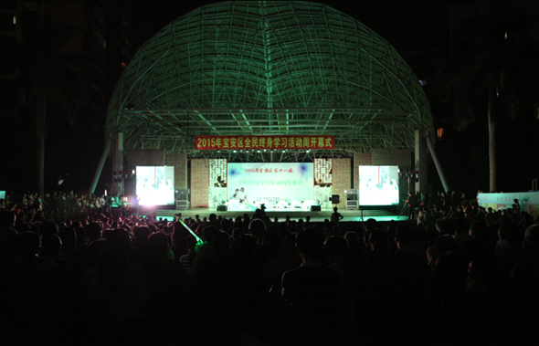 在開幕式上,胡細銀副區(qū)長,區(qū)人民政府教育督導室、區(qū)職業(yè)能力開發(fā)局和西鄉(xiāng)街道辦領導先后對我區(qū)對獲得2014年深圳市“全民終身學習活動周”先進單位及個人代表,獲得2014年“深圳市學習型社區(qū)”、“寶安區(qū)學習型示范社區(qū)”社區(qū),以及2015年“寶安百姓學習之星”進行了頒獎表彰。接著就是精彩的社區(qū)教育才藝表演,6個街道選送的11個節(jié)目輪番上演了一出連臺好戲:《腰鼓-愛我中華》和舞蹈《旗幟頌》抒發(fā)了老一輩居民的赤子情懷;舞蹈《迷霧下的我們》展現(xiàn)了新一代對沖破迷茫的思考;《麒麟舞》彰顯了社區(qū)男人的陽剛之氣;舞蹈《蝶戀花》和《肚皮舞》則演繹了都市婦女的愛心之美和健康之美……本次開幕式除了節(jié)目精彩之外,還有一大亮點就是通過LED屏同步視頻、免費WiFi、無人機航拍、送學習流量紅包、節(jié)目點贊等技術手段,“樂學寶安”社區(qū)教育與職業(yè)培訓數(shù)字化學習測試平臺及微信公眾平臺對開幕式全程進行了互動傳播,原計劃安排幾百名觀眾座位的廣場很快就擠滿了觀眾,搶學習流量紅包和為節(jié)目點贊環(huán)節(jié)不僅把晚會推向了高潮,還瞬間引爆了現(xiàn)場觀眾的微信群和朋友圈,現(xiàn)場居民和網友紛紛關注了官方微信和參與互動,迅速擴大了本次活動周影響,也為引導居民改變學習方式、優(yōu)化學習體驗進行了有益的實踐。