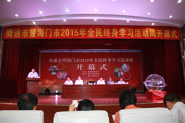 10月23日,南通市暨海門市2015年全民終身學習活動周開幕式在海門開放大學隆重舉行。南通市教育局副局長姜學勤、海門市人民政府副市長王擁軍、南通市人大常委、南通開放大學副校長景圣琪等領導出席,南通市教育局職社教處處長李俊華主持開幕式。