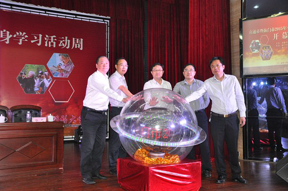 熱烈的氣氛中,南通市教育局副局長姜學勤、南通開放大學副校長景圣琪等領導一起啟動了水晶球旋轉按鈕,南通市2015年全民終身學習活動周正式拉開帷幕。