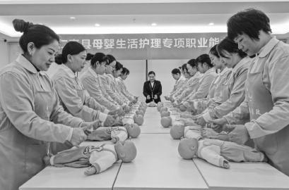 “大腦袋,真聰明,長大要當(dāng)博士生……”1月13日上午9點,在仁壽縣白貓家政職業(yè)培訓(xùn)學(xué)校的母嬰生活護理培訓(xùn)室內(nèi),當(dāng)天的第一節(jié)課正在進(jìn)行,24名返鄉(xiāng)婦女和指導(dǎo)老師一起,正在模擬練習(xí)嬰兒益智操。