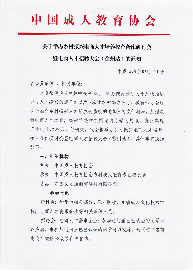 關(guān)于舉辦鄉(xiāng)村振興電商人才培養(yǎng)校企合作研討會暨電商人才招聘大會(徐州站)的通知