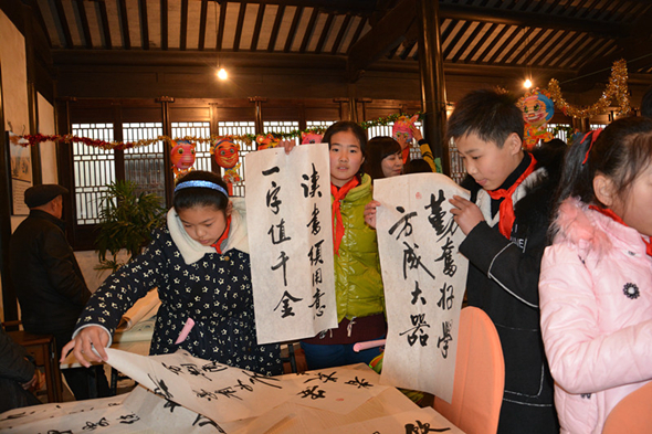整場活動共分“頌好家規(guī)—傳好家風—猜百家姓—寫好家規(guī)”四個環(huán)節(jié)。國學館的學生和老師通過吟唱弟子規(guī)、表演茶道和宣講身邊好人故事等形式給現(xiàn)場學生上了一堂家風家訓開學第一課。其間主持人還講述了楊岱感人的孝心和楊氏孝坊的來歷,讓學生們深受教益。第三環(huán)節(jié)是猜百家姓活動,50多條燈謎懸掛的大紅燈籠下,顯得格外喜慶?,F(xiàn)場學生們看著一條條燈謎,或低頭思考,或激烈討論,氣氛活躍。鳳凰鎮(zhèn)老年大學四位書法老師現(xiàn)場書寫了近200條家風家訓,贈送給參加活動每位學生,學生們紛紛表示回家之后要把家風家訓貼到自己的床頭,作為自己的座右銘。